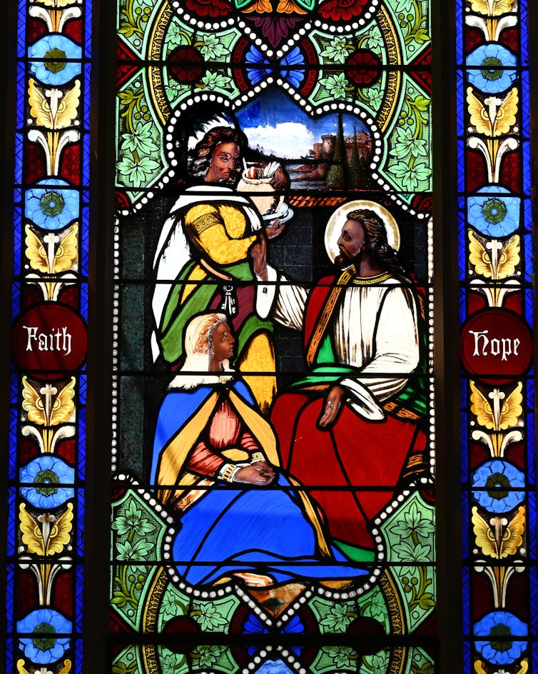 In a second image on the same window, Christ speaks with a Samaritan woman alone, which, during that time, men were not supposed to do. Additionally, the Samaritans, an ethnic group living in the Middle East, were viewed at the time by the Jews as different and inferior. Christ, however, asks her for water and tells her that he is Son of God, the Messiah.